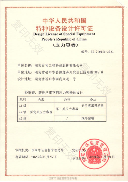 Design License of Special Equipment for A1, A2, A3 Categories (Pressure Vessel)
